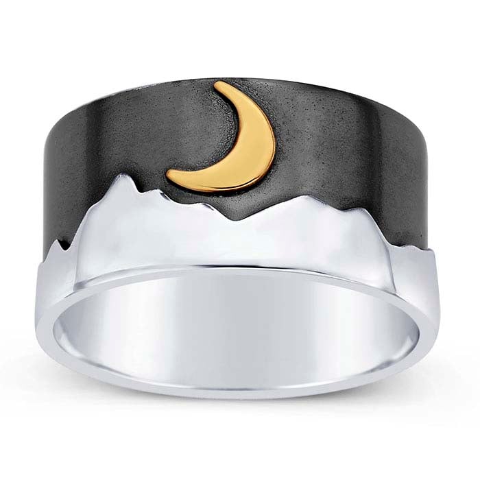 This sterling silver two-layer ring features a brightly finished raised mountain range under a bright bronze crescent moon, both layered on top of an oxidized "night sky" background—providing a striking tri-color effect and great visual depth. The sides and inner surface of the ring are smooth with a bright finish.