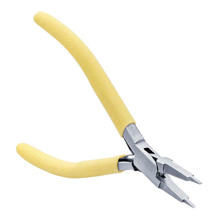 These tapered flat-nose pliers have a stepped, sharply tapered 1.5mm tip that make them great for chainmail work; the tapered, narrow-ended tips allow you to get in closer to jump rings and secure a tighter grip on the ring edges as you work different weaves. On flat-nose pliers, both jaws are flat, with a smooth interior surface that helps protect the surface of metal or wire against marring. These pliers have a box joint; one half of the joint surrounds the other, and the pivot is contained within. This joint holds its alignment far longer than a lap joint but allows the tool to open only as far as the box size. The double-leaf spring consists of flat, tempered metal tabs attached to the inside of each tool handle, positioned to meet and hold the handles apart (and the jaws open) until they are squeezed closed. The handles are coated with a soft foam to ensure comfort and a secure grip.