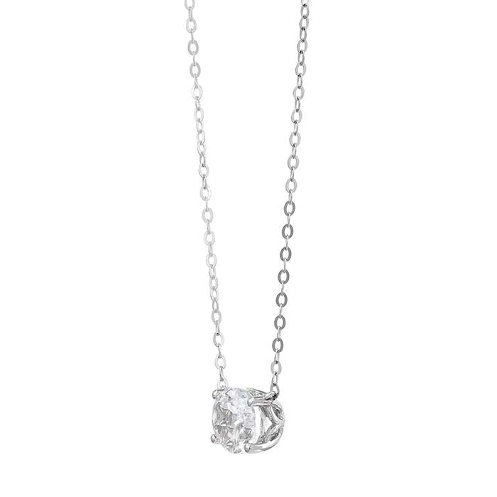 This finished 10-karat white gold necklace is set with a 9 x 7mm oval lab-grown white sapphire faceted gemstone, offering an economical alternative to diamond, the birthstone for April. The pendant is suspended between two lengths of rolo chain and a spring ring clasp completes the necklace.