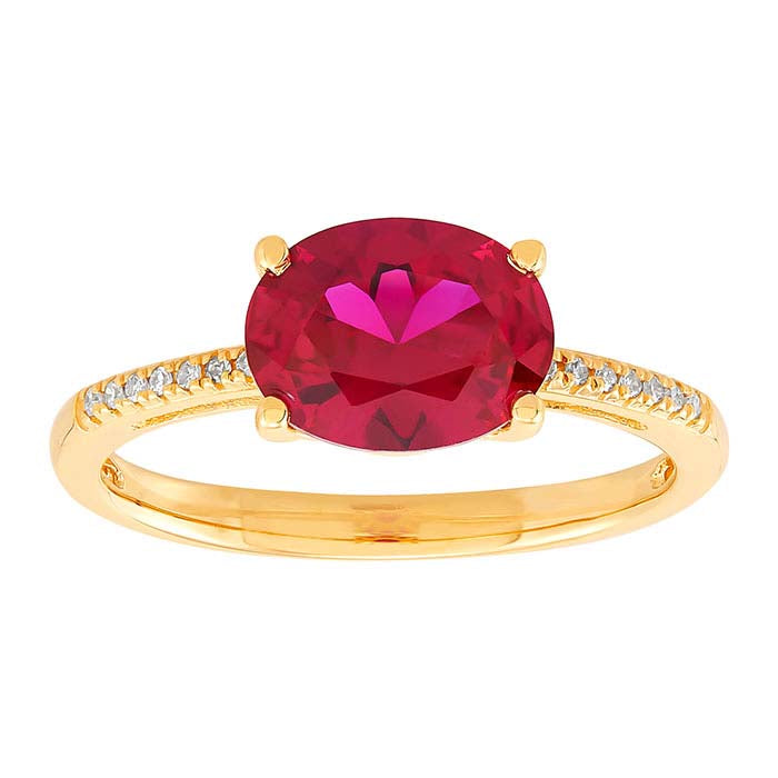 This 10-karat yellow gold ring features a center 9 x 7mm oval lab-grown ruby faceted gemstone, the birthstone for July. The delicate band is set with several round white diamonds (I3 clarity/I–J color; 0.042CTTW).