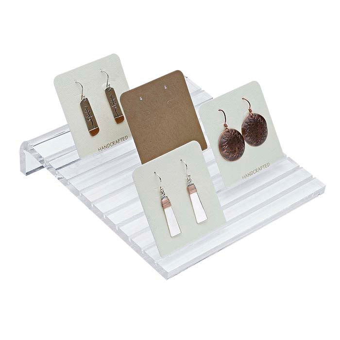 This clear acrylic angled display has 10 slots running along its width, so you can arrange individual jewelry cards as you like, either in rows or staggered for increased visibility. The slots hold cards upright, and accommodate standard sizes of cardstock so you can use your original designs. The angle of the display provides optimal viewing. Slots are 1/2" apart. Made of 3/8"-thick clear acrylic.