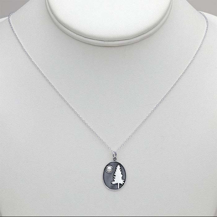 This finished sterling silver necklace features a tree with a pearl moon pendant that is oxidized to highlight the details. The necklace is completed with a spring ring clasp. It has a ".925" sterling silver stamp as a symbol of guaranteed product quality.