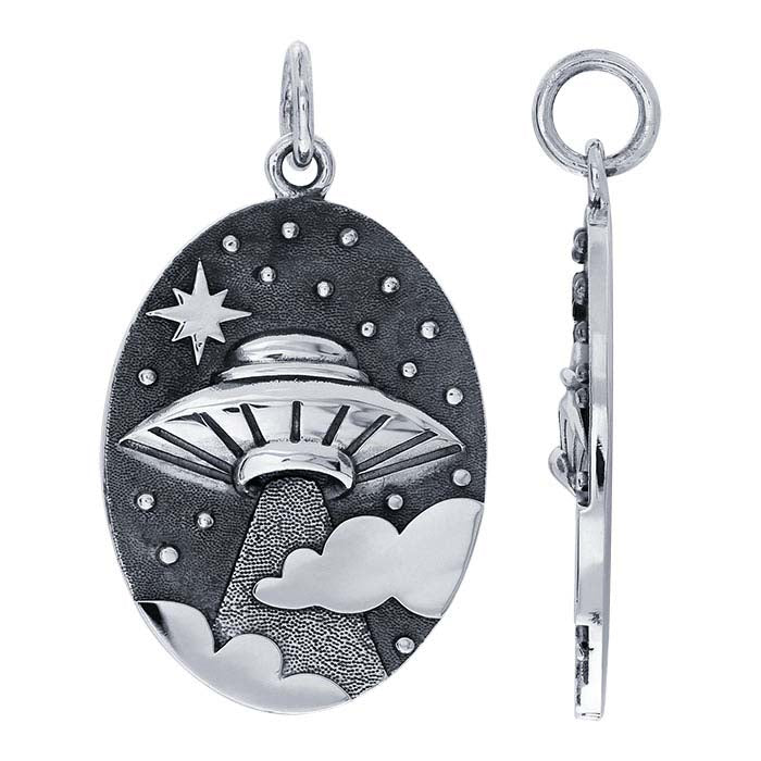 This oval sterling silver pendant features a UFO in a night sky with clouds and stars, oxidized to highlight the brightly finished UFO, clouds and stars on a dark background. Create a necklace, or combine it with other charms and components in a more complex design. The pendant includes a jump ring.