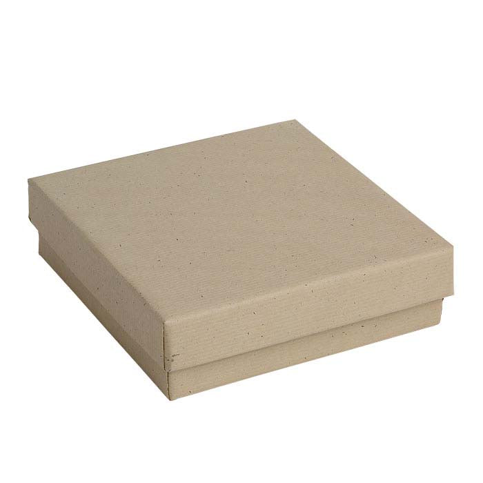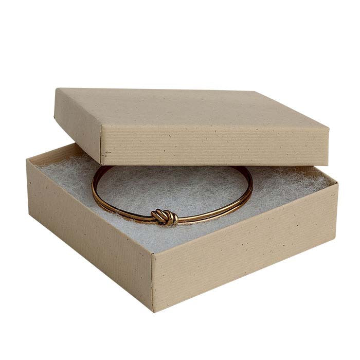 This paper-covered, two-part universal box accommodates a variety of jewelry styles. Use the box as-is, or mix & match it with solid-color cardboard boxes to create color combinations to suit your brand, for seasonal packaging, or for special occasions. Add a decorative ribbon, gift wrapping, or bow (available separately) to customize each box. Wheat-color recycled paper (100% post-consumer fiber) covers the 100% recycled cardboard box (made with 90% post-consumer fiber and 10% pre-consumer fiber); the box includes a 1/2"-thick white poly-fill wadding that will not cause tarnish.Hot stamp your gift box with your company name or logo, keeping you top-of-mind long after the jewelry sale.