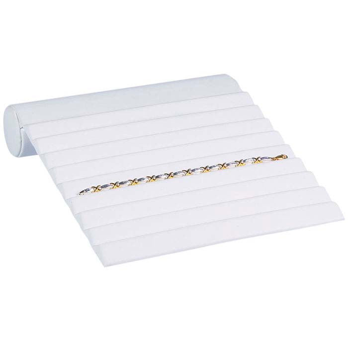 This inclined display holds nine bracelets, making the most of limited display space. Lay the bracelets horizontally across the face of the display; the slight ledges hold them in place without pins or hooks. The white faux leather presents a sophisticated look that doesn’t compete with your jewelry designs. Faux leather covers padded wood and cardboard forms.
