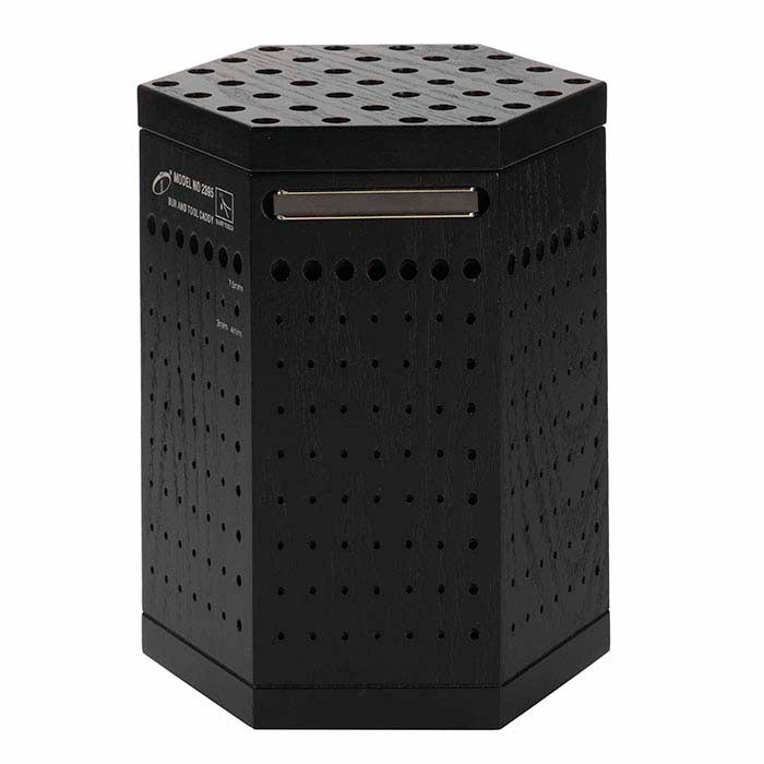Quality-made with rich-grained wood, this black six-sided rotating bur organizer doubles as a handy storage box. The exterior of the organizer features space for 288 3mm-shank burs, 48 4mm-shank burs and 42 7.5mm diameter tools as well as two 3" x 7/16" magnetic tool strips. The top of the box features 19 11mm diameter holes ideal for holding tweezers, files and other small tools. Lift off the top of the box to reveal a roomy interior space perfect for storing a variety of tools and supplies—out of sight but close at hand. Because the entire box rotates smoothly, each and every tool is clearly visible and immediately accessible.