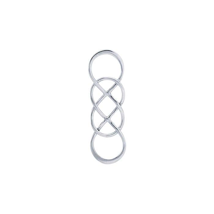 Este componente de plata esterlina tiene un acabado brillante y presenta dos símbolos de infinito entrelazados, parcialmente aplanados en los extremos opuestos, lo que le da profundidad e interés visual. Úselo como colgante, como pieza central estilo festón para un collar o pulsera, o conecte varios para crear una cadena única.