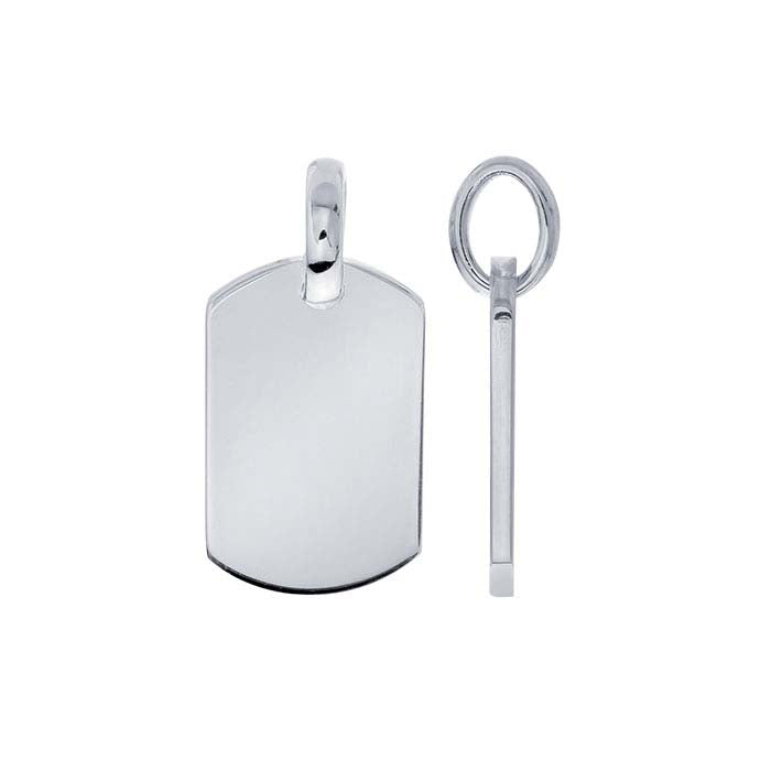 Este colgante de plata de ley presenta un rectángulo de 19.5 x 12.5 mm con un acabado liso y brillante, perfecto para personalizar con un detalle estampado o grabado en uno o ambos lados. Un asa ligeramente abovedada y cónica complementa el colgante y permite que se ensarte fácilmente en un cordón o cadena.