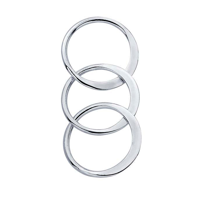 Este componente de plata esterlina hecho a mano presenta tres círculos unidos con un acabado suave y brillante; la mitad de cada círculo está aplanada, lo que le da al componente un aspecto dinámico y siempre cambiante. Use el componente para un pendiente simple y llamativo, o deslícelo directamente sobre una cadena o cordón para un colgante. Es ideal para diseños colgantes y como eslabones en un collar o pulsera.