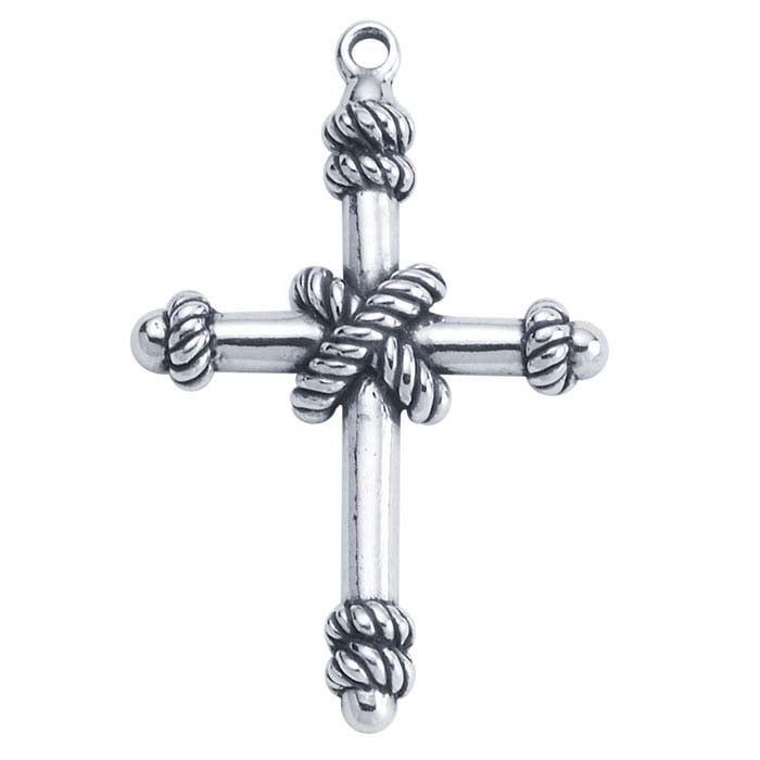 This sterling silver cross pendant features rope-like accents criss-crossed around the center and at each end of the cross arms. To complete the pendant, attach a bail, and use it as a pendant on a cord or chain, or combine it with other components in a more complex necklace or bracelet design. The pendant is oxidized to highlight the rope details.