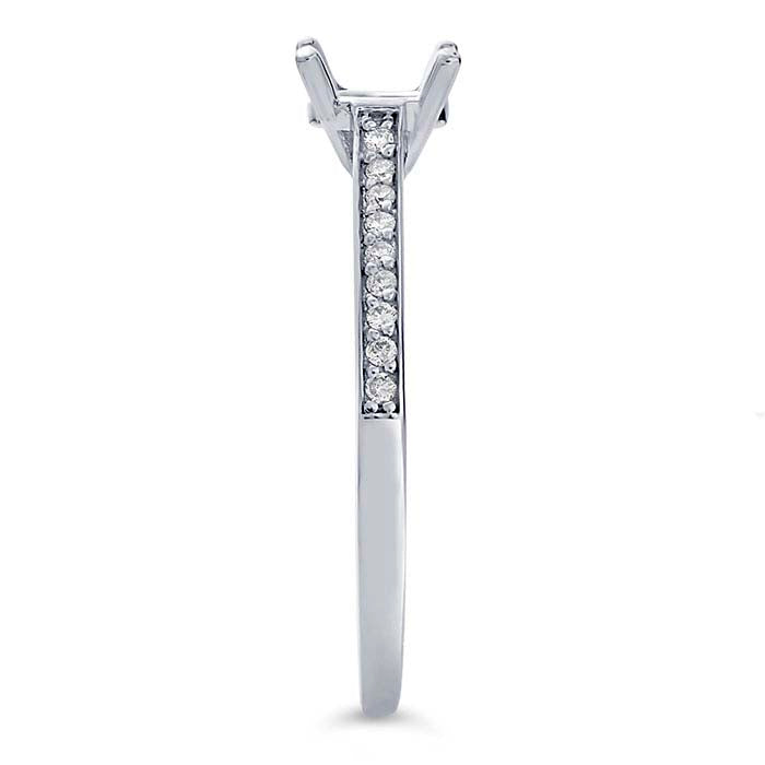 This 14-karat white gold ring mounting features a 4-prong basket mounting that holds one 5mm (1/2-ct., approx.) round faceted gemstone. The basket mounting features open sides designed to allow more light to reach and move through the stone, enhancing its brightness and brilliance. The shank is set with eighteen 0.0075-ct. round diamonds (SI clarity/G, H color; 0.135CTTW), nine on each side of the center mounting, in individual 4-prong mountings. Cut a seat in the prongs to accommodate your stone, then burnish the prongs over the stone to secure it in place.