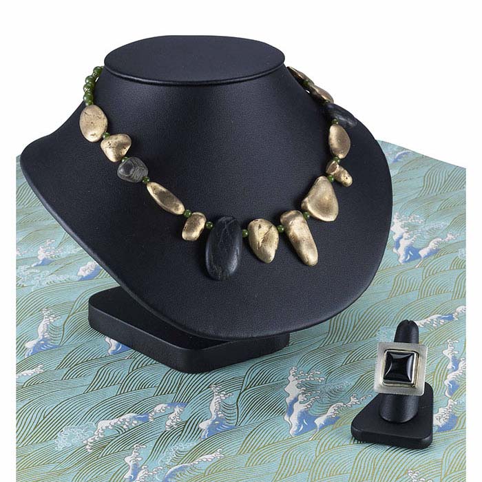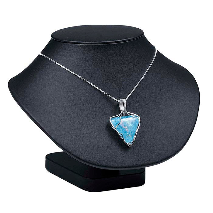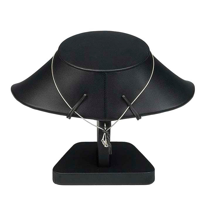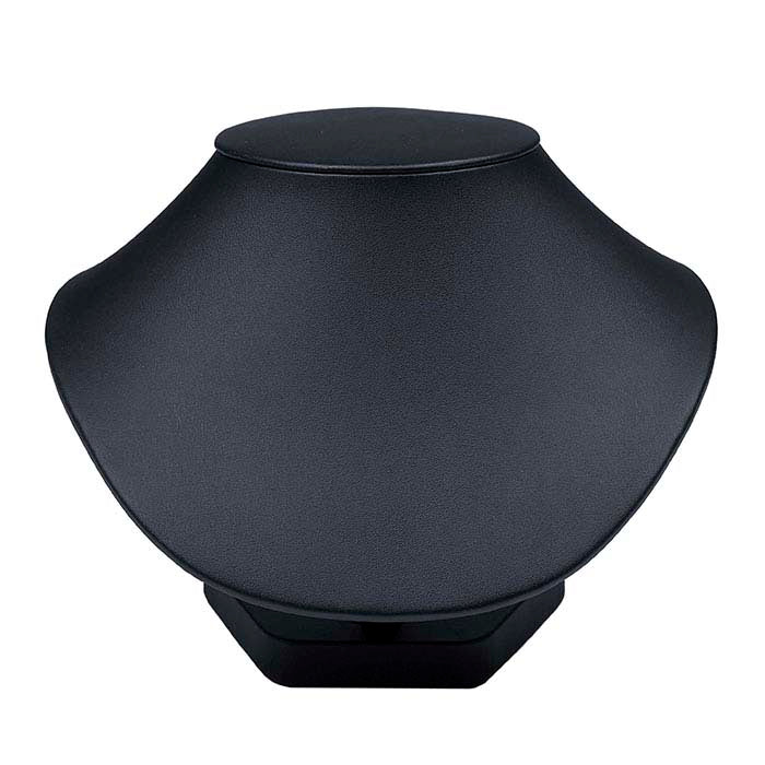 Este busto para collar sostiene uno o más collares o cadenas de diferentes longitudes; el clásico cuero sintético negro es un complemento ideal para una amplia variedad de diseños de joyería, incluyendo metales monocromáticos y diseños de cuentas y hilos de colores brillantes. Los contornos realistas del busto muestran collares y colgantes con una caída natural, para que los clientes puedan ver cómo lucirá la joyería al usarse; dos pestañas y un ojal montado en la parte trasera de la forma aseguran el collar en la longitud óptima y sostienen el exceso de cadena para una presentación profesional. El cuero sintético negro cubre madera acolchada y cartón.