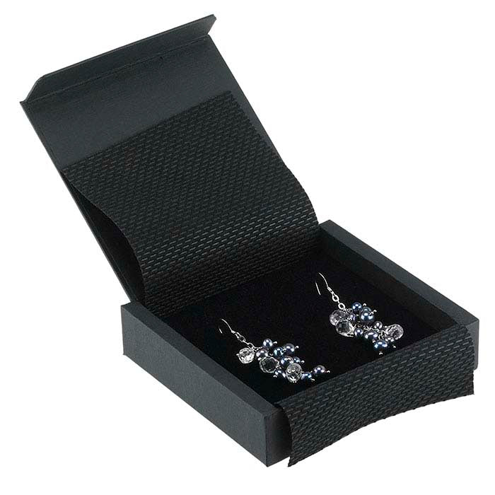 Esta caja de regalo Vario cubierta de papel acomoda un colgante grande o un par de pendientes. El diseño de esta caja presenta un cierre simple de plegado con un llamativo recorte en forma de 'V' en la parte frontal de la caja. Añada una cinta decorativa, envoltorio de regalo o lazo (disponibles por separado) para personalizar la caja. Papel negro cubre la caja de cartón; incluye un inserto de espuma aterciopelada del mismo color con solapas protectoras. Estampe en caliente su caja de regalo con el nombre o logotipo de su empresa, manteniéndolo presente mucho después de la venta de joyería.