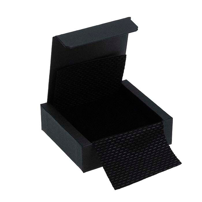 Esta caja combinada Vario cubierta de papel acomoda un colgante y/o un par de pendientes, lo que la hace ideal para conjuntos coordinados. El diseño de esta caja presenta un cierre simple de plegado con un llamativo recorte en forma de 'V' en la parte frontal de la caja. Añada una cinta decorativa, envoltorio para regalo o lazo (disponibles por separado) para personalizar la caja. La caja de cartón está cubierta con papel negro; incluye un inserto de espuma aterciopelada del mismo color con solapas protectoras. Estampe en caliente su caja de regalo con el nombre o logotipo de su empresa, manteniéndolo presente mucho después de la venta de la joyería.