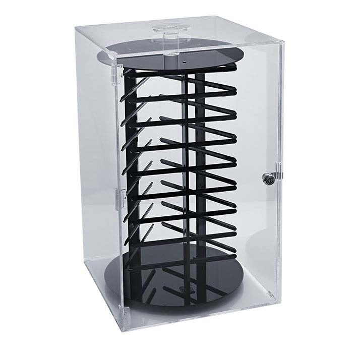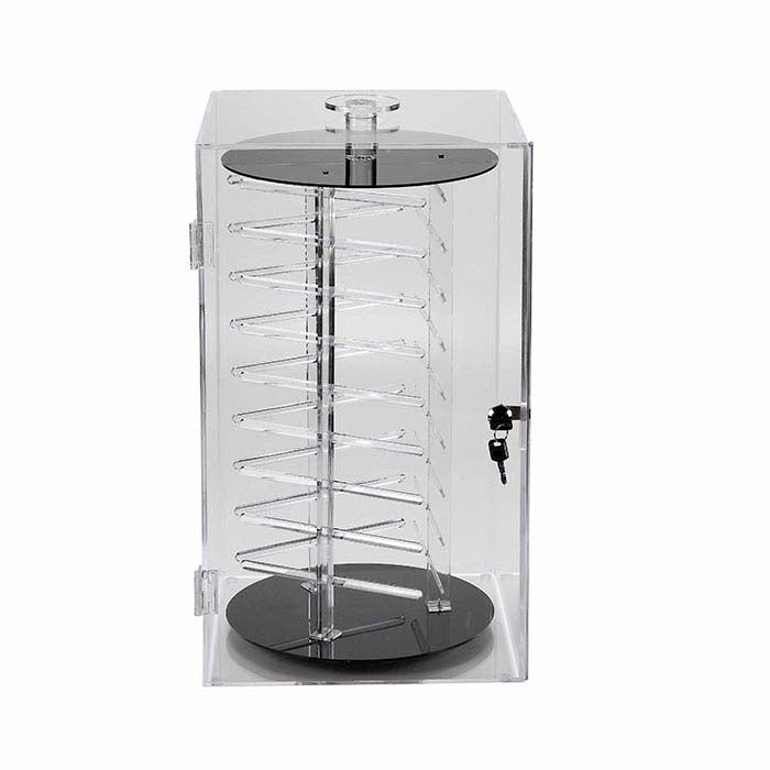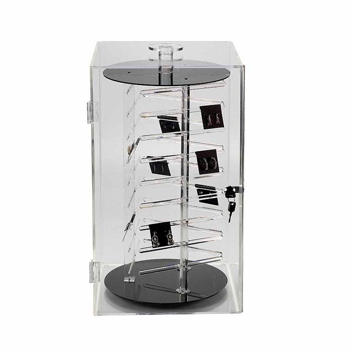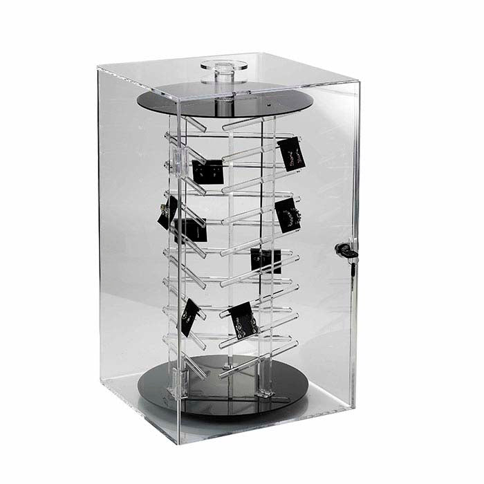 Esta vitrina de acrílico transparente con cierre para mesa es una forma ideal de mostrar una amplia selección de pendientes en un espacio limitado y exhibir de forma segura sus joyas en la parte superior de su vitrina. La caja exterior encierra una exhibición giratoria de acrílico de tres lados que puede contener hasta 108 tarjetas de pendientes de 2"; una perilla en la parte superior de la caja permite a los clientes girar la exhibición para explorar su colección. La caja es con cerradura; se incluyen dos llaves. La caja está hecha de acrílico resistente de 1/4" y tiene patas de goma para proteger las superficies del mostrador. La parte superior y la base del soporte son de acrílico negro con un mecanismo de giro suave. Las escaleras son transparentes; hay 2" de espacio entre cada escalera.