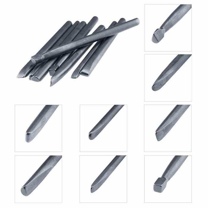 Estas herramientas, tratadas térmicamente en horno y fabricadas con acero para herramientas A2 totalmente templado, están diseñadas y moldeadas a mano por el maestro orfebre Matt Weber. Con un uso adecuado, le durarán toda la vida a cualquier joyero. Especialmente adecuadas para trabajos de repujado en alto relieve en piezas de joyería grandes. Este juego de ocho piezas incluye: