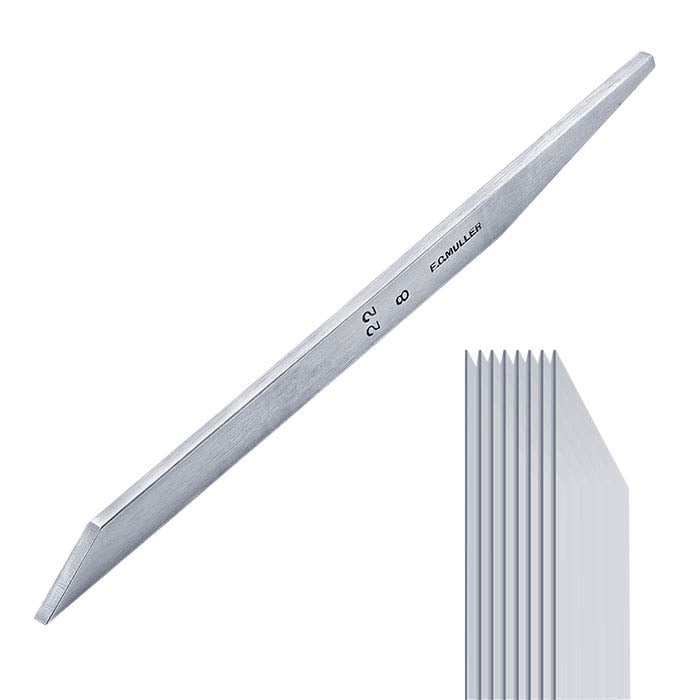 Esta buril recto E.C Muller #22 ofrece ocho líneas espaciadas uniformemente (0.279mm de separación) en la superficie de corte de la cara del buril (el ancho es aprox. 2.2mm). Los buriles de línea están disponibles con diferentes cantidades de líneas en la superficie de corte y el número de tamaño del buril define el ancho entre estas líneas. Use buriles de línea para letras en bloque, acabados florentinos, sombreado de fondo y patrones de tramado cruzado en superficies metálicas planas o convexas; son especialmente ideales para estilos de grabado occidental. Elija buriles rectos para la mayoría de las aplicaciones; acorte, modele y afile la cara según sea necesario para el trabajo que esté realizando. La composición de acero al carbono alto de este buril permite que se modele y afile fácilmente, siendo adecuado para su uso en todo tipo de metales.