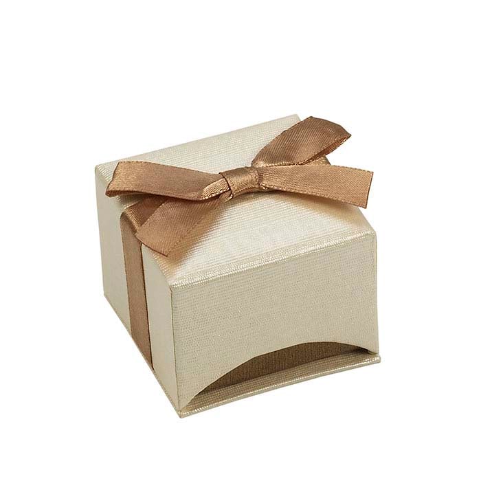 Caja de regalo para anillo de papel de lino crema y dorado envuelta con cinta
