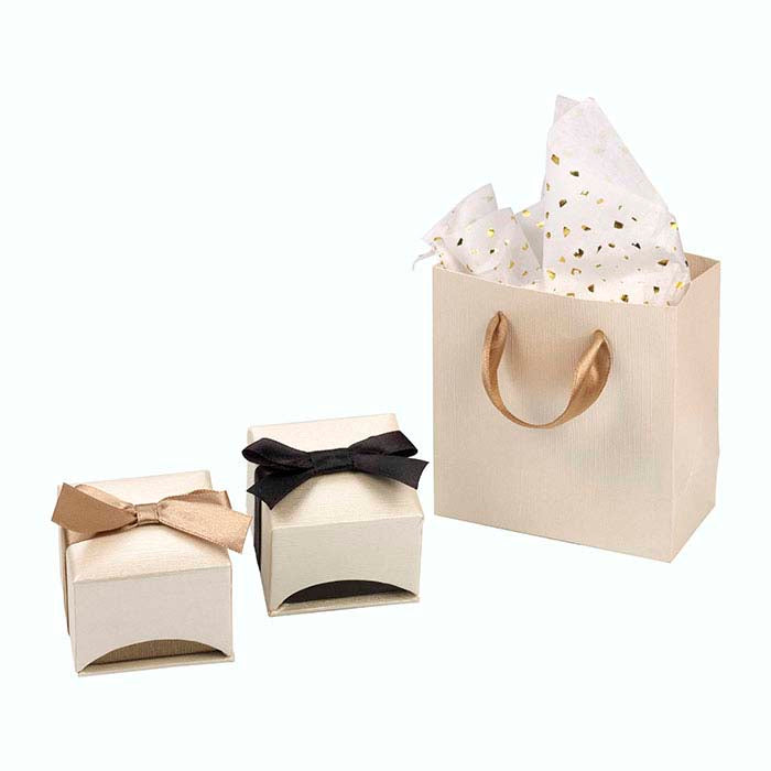 Esta llamativa caja de regalo de dos partes acomoda un solo anillo; la tapa presenta un lazo y cinta permanentemente fijados como adorno y no requiere decoración adicional, lo que la convierte en una opción de embalaje fácil y que ahorra tiempo. La tapa tiene un recorte ondulado en dos bordes inferiores que facilita la apertura de la caja. El fondo de la caja de cartón está cubierto con papel de textura de lino color dorado; la parte superior de la caja está cubierta con papel de textura de lino color crema. El inserto es de espuma blanca flocada troquelada; la cinta decorativa coincide con el color del fondo de la caja.