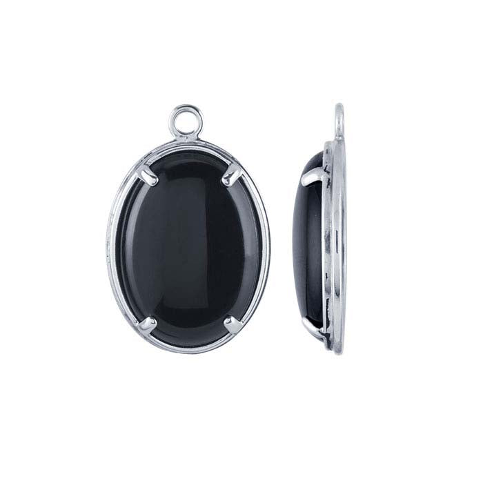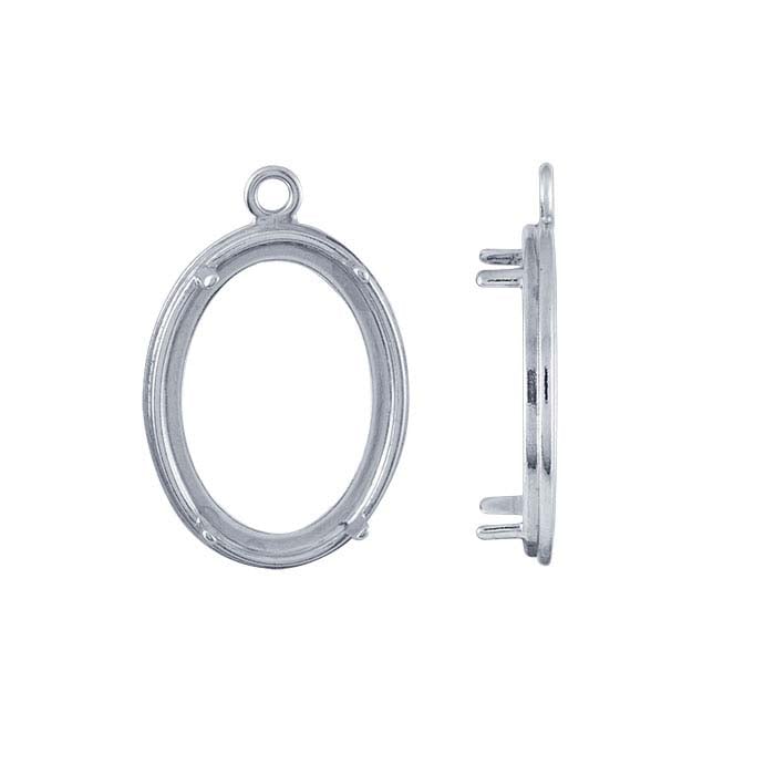 This sterling silver pendant features a cabochon mounting with four prongs that holds one 25 x 18mm oval cabochon or other flat-back stone. For a custom pendant design, attach any style of bail to the fixed ring at the top of the mounting and string the pendant onto a chain or cord. This cabochon mounting features a flat, open base and raised edges; the open back reduces the overall metal weight, making it cost-effective. Set your cabochon into the mounting, then burnish the prongs over the stone to secure it in place.