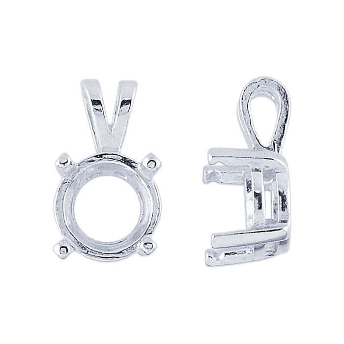 This sterling silver Legendary™ pendant mounting features a tapered rabbit-ear bail and a pre-notched 4-prong basket mounting that holds one 7mm round faceted gemstone. Basket settings feature open sides designed to allow more light to reach and move through the stone, enhancing its brightness and brilliance.
