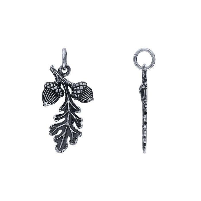 This sterling silver pendant features a flat oak leaf on a branch with two detailed acorns. It has the silhouette of a real oak leaf, offering a life-like look to the pendant—oxidized to add dimension. The pendant looks great on its own or combined with strung components and charms in more complex necklace designs. This pendant includes a closed ring.