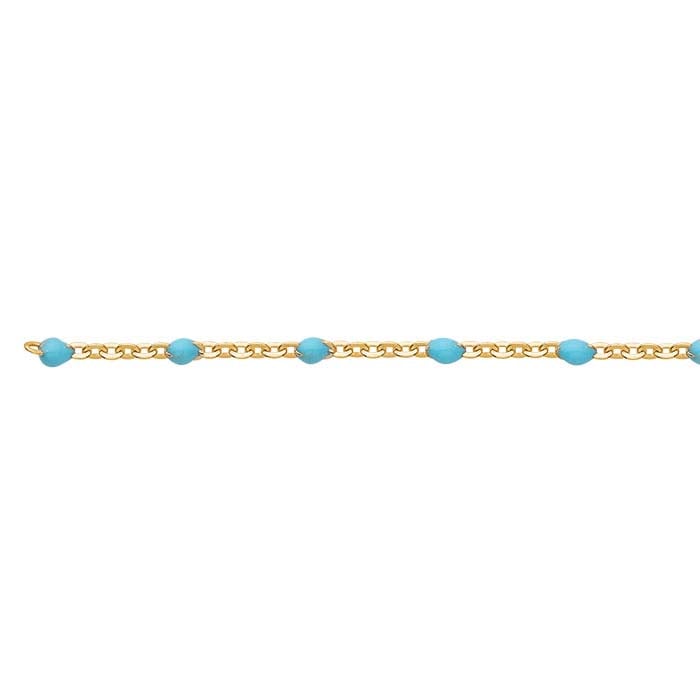 Tämä 14/20 keltakultainen täytetty ovaalinen kaapeliketju on päällystetty turkoosilla emalilla. Tarjoa se sellaisenaan tai lisää pieniä riipuksia, helmiä tai koristeita yksilöllisen ilmeen luomiseksi.