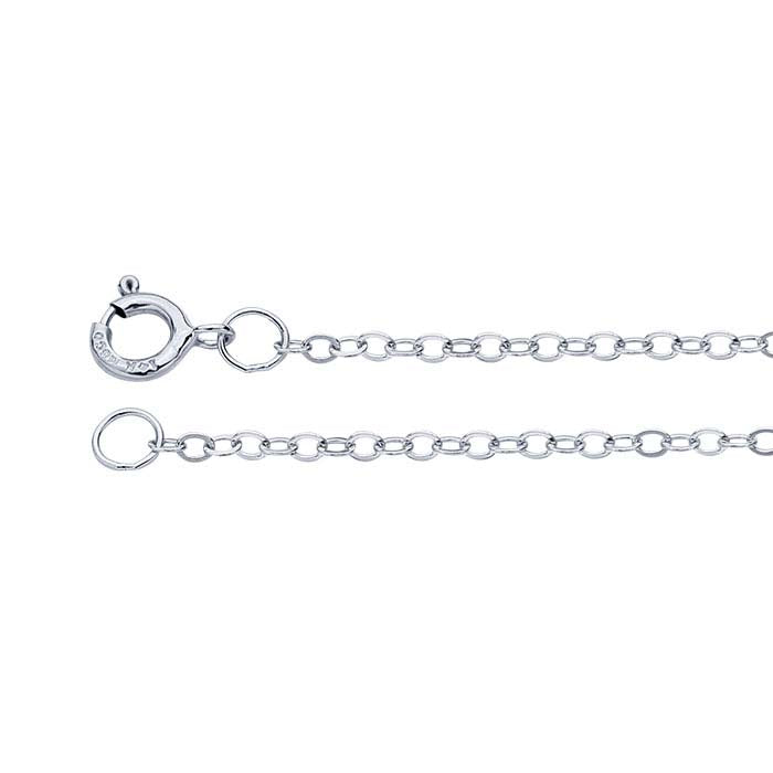 Yksinkertainen ja klassinen, tämä 14 karaatin valkokultainen litteä kaapeliketju tarjoaa kullan kiillon ja valkoisen metallin monipuolisuuden – se sopii lähes minkä tahansa design-tyylin riipuksille, pisaroille ja roikkuville koristeille. Ketju on rodinoitu kestävän ja tummumista estävän pinnan varmistamiseksi. Yleisin ketjutyyppi, kaapeliketjut muodostuvat yksinkertaisesti yhdistämällä yksittäiset lenkit kohtisuoraan peräkkäin. Lenkit voivat olla pyöreitä, soikeita tai muita muotoja.