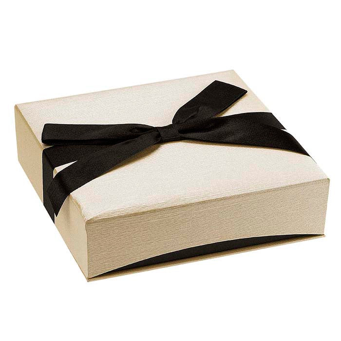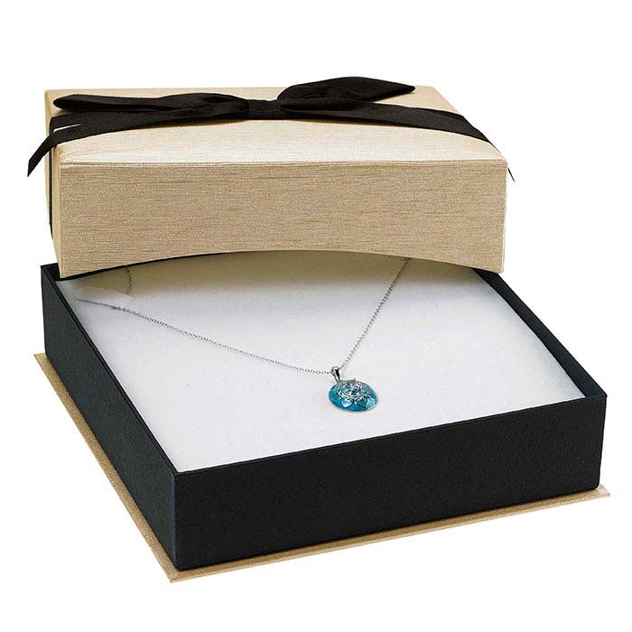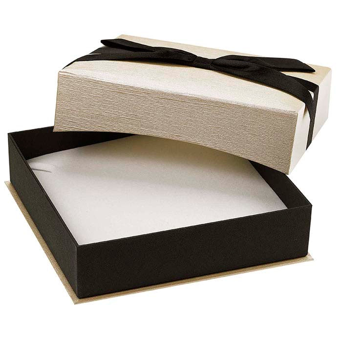 Tämä silmiinpistävä kaksiosainen lahjalaatikko sopii kaulakorulle; kannessa on pysyvästi kiinnitetty nauha ja rusetti, joten lisäkoristelua ei tarvita, mikä tekee siitä helpon ja aikaa säästävän pakkausvaihtoehdon. Kannessa on aaltoileva leikkaus kahdella alareunalla, jotka helpottavat laatikon avaamista. Laatikon pohja on päällystetty mustalla pellavakuvioisella paperilla; laatikon yläosa on päällystetty kermaan vivahtavalla pellavakuvioisella paperilla. Sisäosa on valkoista, leikatulla karvalla päällystettyä vaahtomuovia; koristeena oleva nauha on samaa väriä kuin laatikon pohja.