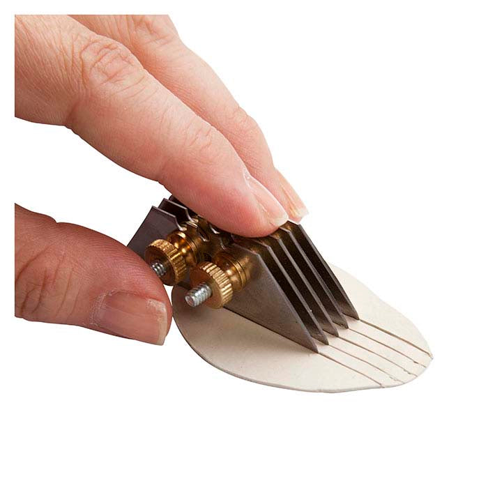 Luo täydellisen rinnakkaisia savenauhoja lähes missä tahansa leveydessä aina 1/2" (12mm) asti tällä käsiterätyökalulla. Työkalu sisältää viisi terää ja 12 paria messinkisiä aluslevyjä. Järjestä terät ja aluslevyt erilaisiin kokoonpanoihin saavuttaaksesi haluamasi leveyden. Esimerkiksi käytä kahta terää kaikkien 12 aluslevyparin kanssa luodaksesi yhden noin 1/2" leveän nauhan. Tai käytä kaikkia viittä terää yksittäisten aluslevyparien erottamina luodaksesi neljä noin 1/32" (0.8mm) leveää nauhaa. Yhdistä teriä ja aluslevyjä vapaasti saavuttaaksesi haluamasi leveyden tai leveydet. Kauli metallisavea tasaiseksi, pidä sitten terätyökalua hieman vinossa, käytä napakkaa painetta ja vedä terät hitaasti ja tasaisesti saven läpi.