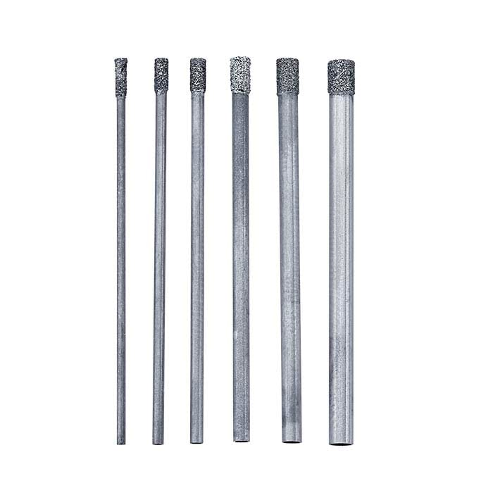 Tämä sarja sisältää kuusi poranterää, jotka ovat onttoja koko varren pituudelta, mikä auttaa poraamaan nopeammin ja vähemmällä tukkeutumisella. Ihanteellinen helmien suurentamiseen ja pienempien reikien poraamiseen kiveen, lasiin, metalliin ja keramiikkaan. Porat ovat nikkelöityjä ja niihin on upotettu 180-karkeusluokan teollisuustimantteja. Varret vaihtelevat pään koon mukaan. Tämä sarja sisältää kuusi timanttiteräistä ydinporanterää, yksi kutakin halkaisijaa (OD): 1.0, 1.25, 1.5, 1.75, 2.0 ja 2.5 mm.