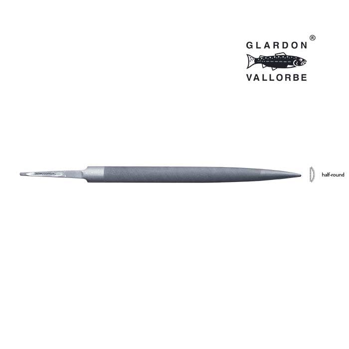 Tämä Glardon Vallorbe® -tarkkuuspuolipyöreä sormustiedosto on yhdeltä puolelta litteä ja toiselta pyöristetty, ja siinä on hampaat molemmilla puolilla; sormustyyppi on kapeampi kuin puolipyöreä tiedosto ja pyöristetyn puolen korkeampi kupu tekee siitä erityisen hyödyllisen sormuksen varren sisäpintojen ja syvempien koverien reunojen tai pintojen tasoittamiseen. Tiedosto on kaksileikkuinen ja kapenee kärkeen, mikä mahdollistaa pääsyn koloihin, pieniin aukkoihin, kulmiin ja suurempien sormusvarsien sisäosiin. Tässä tiedostossa on sveitsiläinen leikkaus #4; sveitsiläiset tiedostot luokitellaan hampaiden lukumäärän mukaan, lasketaan hampaat tiedoston pitkittäisakseliin nähden kohtisuoraan. Kaikissa leikkaustyyleissä suurempi numero tarkoittaa hienompaa leikkausta. Kaksileikkuisessa tiedostossa on kaksi tasaisesti sijoitettua hampaistoa kahdessa suunnassa, joista toinen on hieman eri kulmassa kuin toinen. Kaksileikkuiset tiedostot on suunniteltu leikkaamaan aggressiivisemmin, maksimoiden jokaisen vedon työn poistaen enemmän metallia vähemmillä vedoilla. Vedon lopussa tiedosto tulee nostaa työkalusta ja sijoittaa uudelleen seuraavaa vetoa varten; tiedoston vetäminen taaksepäin metallia vasten voi vahingoittaa metallia ja hampaita. Käsitiedostot, joita kutsutaan myös "täysikokoisiksi" tiedostoiksi, sisältävät suuremman leikkauspinnan, joka on pidempi ja leveämpi kuin muilla tiedostotyypeillä, ja ne soveltuvat erinomaisesti materiaalin nopeaan ja tehokkaaseen poistoon työkalusta alkuperäiseen muotoiluun, tasoitukseen ja hienommissa leikkauksissa viimeistelyyn. Näissä tiedostoissa on kapea, kapeneva varsi, joka on tarkoitettu kiinnitettäväksi kahvaan (myydään erikseen), joka tarjoaa mukavuuden ja hallinnan tiedostoa käytettäessä. Useimpien jalokiviseppien ensisijainen valinta, Glardon Vallorbe® -tiedostot valmistetaan korkeimpien tuotantostandardien mukaisesti Sveitsissä hienoimmasta lämpökarkaistusta kromiseosteräksestä, kovuus 65 HRC. Tiedostot on tarkasti hiottu leikkaamaan nopeasti ja tarkasti sekä kestämään pidempään kuin lähes mikään muu markkinoilla oleva tiedosto.