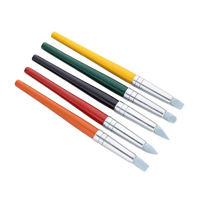 Muotoile, leikkaa, koristele tai piirrä viivoja metallisaviesiineissä tällä silikonimuotoilijasarjalla. Erilaiset kärjet mahdollistavat laajan valikoiman sileitä muotoja ja reunoja ilman tahroja tai sormenjälkiä. Saumattomat nikkeliholkki pitävät pehmeät silikonikärjet kiinni lakatussa kovapuukahvassa. Puhdista pehmeä silikoni nopeasti ja helposti vedellä käytön jälkeen.
