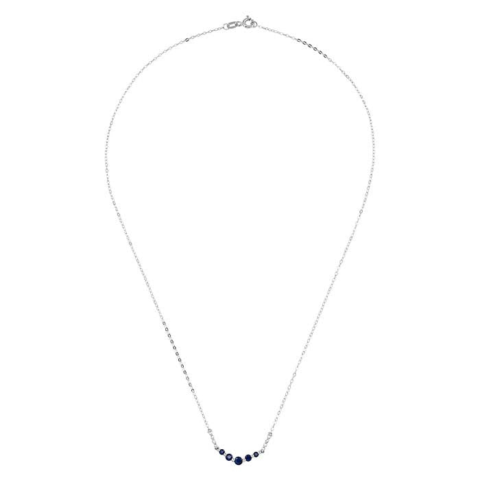 This finished 10-karat white gold necklace is set with five round sapphire faceted gemstones and several round white diamonds (I3 clarity/I–J color; 0.16CTTW). The necklace has a 1-1/4" extender for adjustable length and is completed with a spring ring clasp.