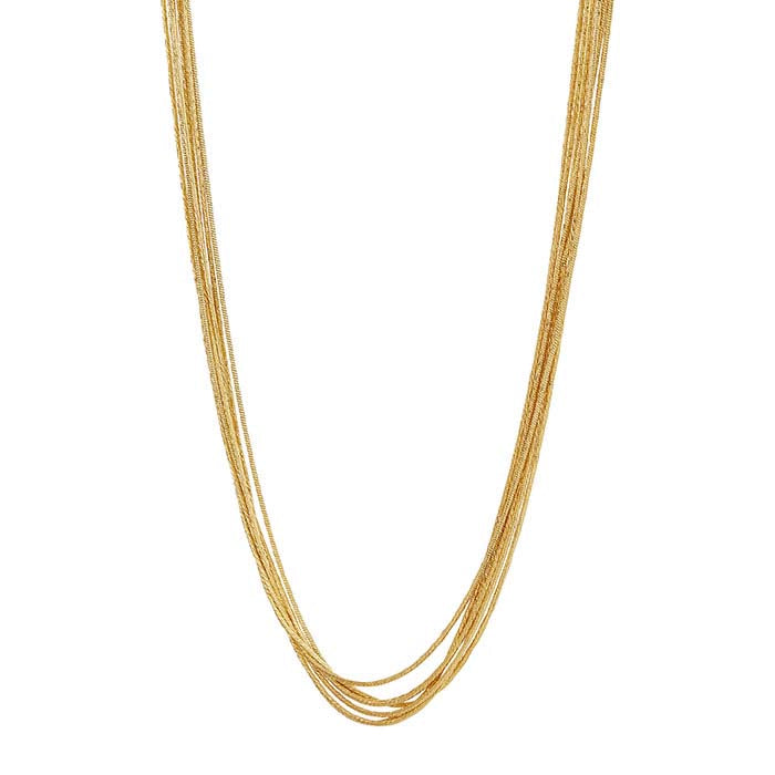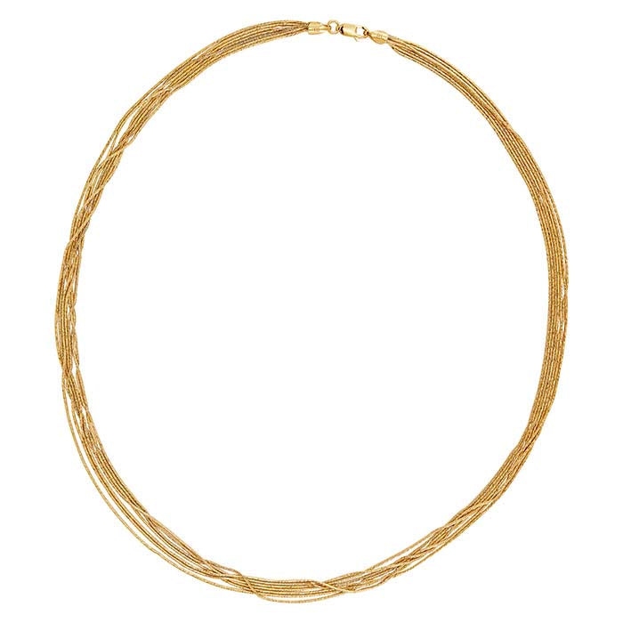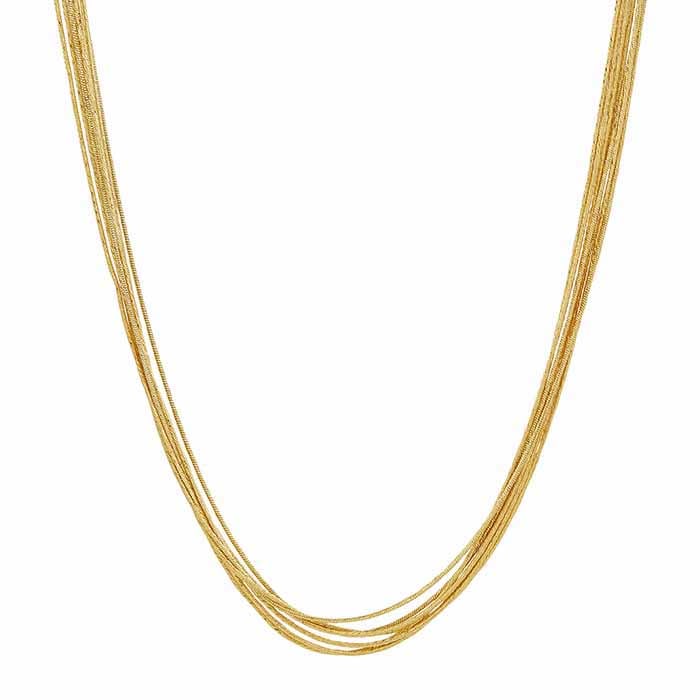 This 14-karat yellow gold-plated sterling silver necklace is made with seven strands of braided herringbone chain. A lobster clasp completes the necklace. It has a ".925" sterling silver stamp as a symbol of guaranteed product quality.
