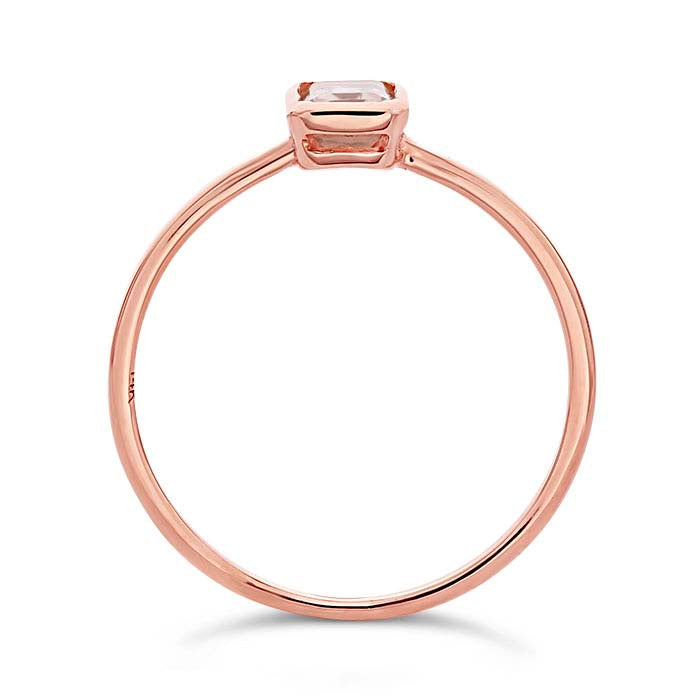 Cette bague en or rose 14 carats est sertie d'une seule pierre facettée en quartz rose de qualité AAA, taille émeraude de 6 x 4 mm. Elle est attrayante en tant qu'accessoire autonome ou empilée en combinaison avec d'autres bagues. Proposez aux clients une variété de styles de bagues empilables à mélanger et assortir, et encouragez-les à créer leurs propres designs modulables.