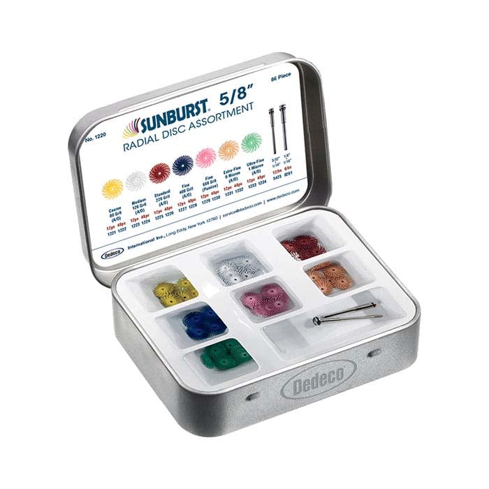 This 84-piece assortment includes Dedeco® Sunburst® 5/8" radial discs and two mandrels. The discs, designed for finishing and polishing, are ideal for accessing hard-to-reach areas while protecting detail. The three-dimensional bristle design provides a uniform finish; stack between three and six discs on one mandrel to create the width that best suits your taskMost applications can be performed between 3,000rpm and 18,000rpm. Use the discs at 3,000rpm to have greater flexibility with a softer touch, producing subtle results. Operate discs at 18,000rpm for more aggressive material removal. Use Sunburst® radial discs in progression to easily achieve your desired finish. Dedeco® Sunburst® radial discs are impregnated with an aluminum oxide abrasive that delivers faster results and a longer life than rubber wheels. They produce minimal heat and dust, and require no polishing compound.