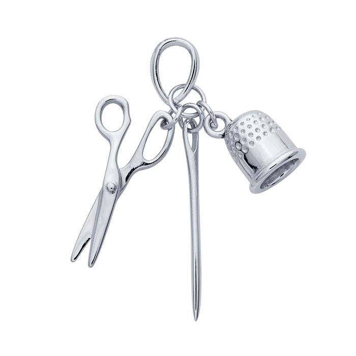 This sterling silver pendant features three charms: scissors, needle and thimble. It looks great on its own or in combination with other charms and components. A rhodium plating ensures a durable, tarnish-resistant finish. This pendant includes a tapered bail.