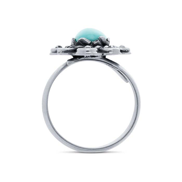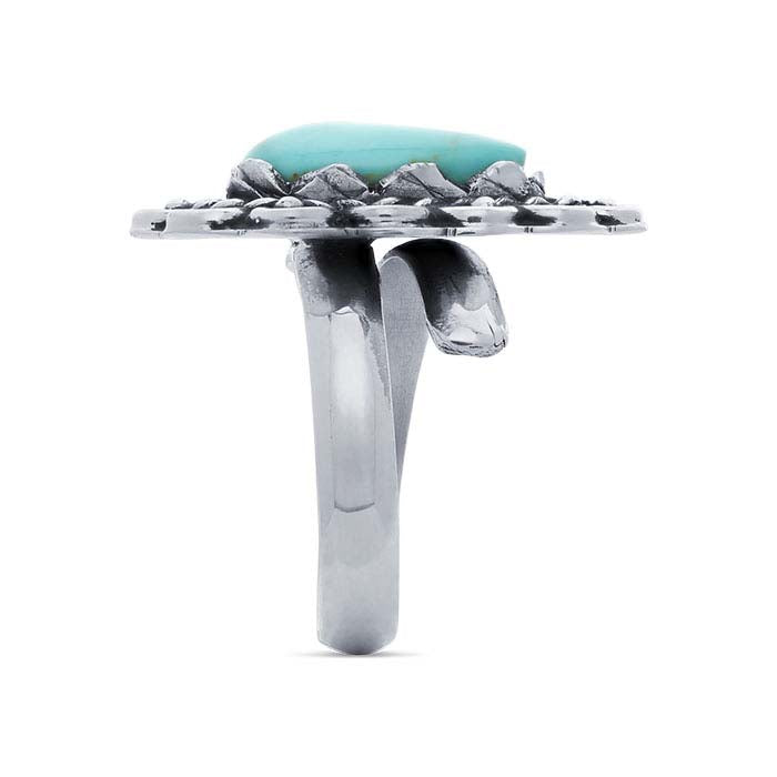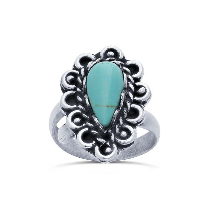 This sterling silver ring features a pear shaped imitation turquoise cabochon in a bezel setting with a decorative oxidized edge. It’s attractive as a stand-alone accessory or stacked in combination with other rings. Offer customers a variety of stackable ring styles to mix and match, and encourage them to create their own changeable designs.