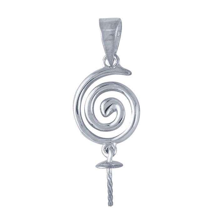 This sterling silver pendant mounting features a solid tapered bail and a dynamic open swirl design with an attached cup and peg mounting. The mounting features a twisted peg and holds one half-drilled pearl or gem ball. Use jeweler’s epoxy to secure the bead or pearl on the peg; the twisted peg increases the surface area for the epoxy and provide a more secure hold.