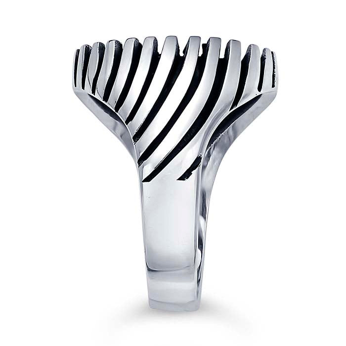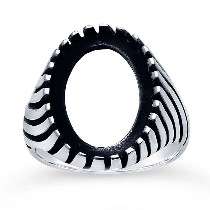 This sterling silver ring features a swirl-ridged shank rising to the open bezel mounting with a bold, oxidized finish that highlights the ridges. Set the ring with one 20 x 15mm oval cabochon using traditional setting techniques. Place your stone in the bezel and push the walls inward over the stone, holding it in place. For added security, if desired, place a drop or two of jeweler's epoxy along the rim before placing the stone.