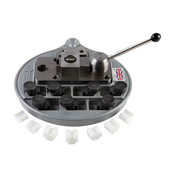 Conçu avec l'expertise primée en design et ingénierie de Durston, cet ensemble de cintreuse à bagues vous permet de créer facilement des courbes et des angles dans des bandes de métal ou des stocks pour bagues. L'outil de cintrage offre sept paires de matrices en acier formé et Delrin® non marquant. Chaque matrice en acier est trempée à 64 HRC et finement polie pour réduire les marques sur les surfaces métalliques. Si désiré, la cintreuse peut être fixée de façon permanente à votre établi grâce aux trous moulés dans la base (quincaillerie non incluse). Cet ensemble comprend sept matrices :