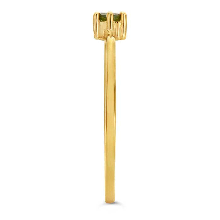 This finished 14-karat yellow gold ring features a 6-prong mounting set with a genuine, 3mm round faceted peridot; the ring has a smooth, bright finish. It's attractive as a stand-alone accessory or stacked in combination with other rings. Offer customers a variety of stackable ring styles to mix & match and encourage them to create their own changeable designs. Peridot is the birthstone for August.