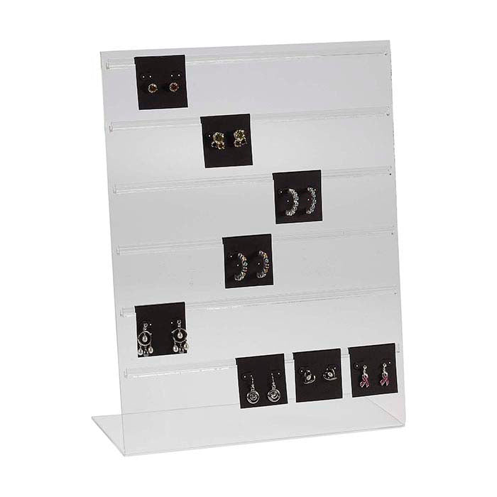 מתקן תצוגת כרטיסים תלוי זה מחזיק עד 36 כרטיסי תכשיטים בגודל 2" על שישה מוטות; האקריליק השקוף מעניק מראה מודרני שאינו גובר על התכשיטים המוצגים. להגדלת קיבולת התצוגה, הוסף מאריכי וו J (לא כלולים). התצוגה מונחת בזווית קלה לצפייה אופטימלית. האקריליק בעובי 1/8" עם קצוות מלוטשים; 2" של מרווח מפריד בין כל מוט.