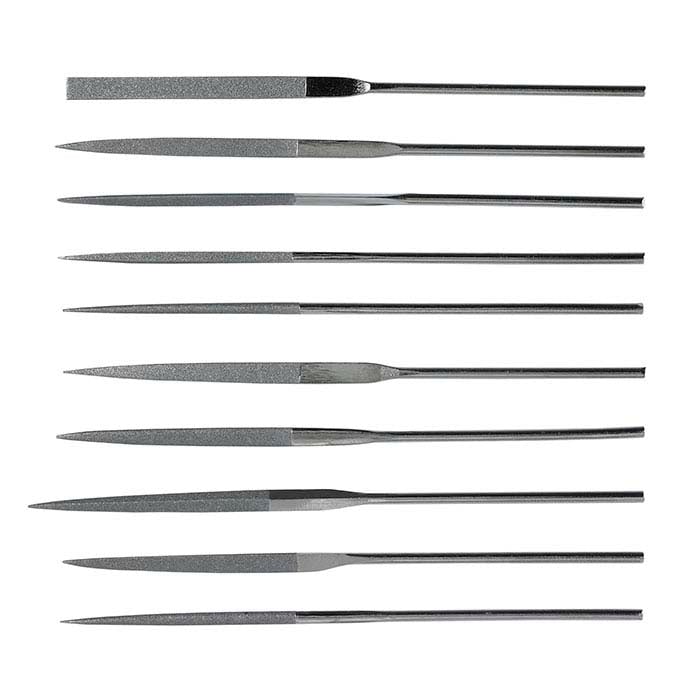 סט חסכוני זה של פצירות מחט יהלום כולל 10 צורות פצירה נפוצות כדי להבטיח שתהיה לך גישה נוחה לסגנון הדרוש לך מתי שצריך. הסט כולל פצירה אחת בכל צורה עם גרעין 120/140: שטוחה, warding, עגולה, חצי-עגולה, barrette, אליפטית, slitting, סכין, שלוש-מרובעת ומרובעת בתוך מארז נשיאה מפלסטיק. פצירות יהלום מתאפיינות במשטחי חיתוך שנוצרים על ידי הטמעת חלקיקי יהלום תעשייתי בחומר פני השטח של הפצירה. קצוות החיתוך החדים וקושי היהלום הופכים פצירות אלו ליעילות על חומרים שבירים כגון אבן, קרמיקה או זכוכית ועל מתכות קשות מאוד כגון פלדה מוקשה או פלטינה. פצירות יהלום חותכות במהירות ובחלקות בכל משיכה, קדימה או אחורה. פצירות מחט מתאפיינות בפרופיל מיקרו עם משטח חיתוך קצר יותר (בדרך כלל כשליש מאורכן) וידיות עגולות וצרות. פצירות קטנות אלו אידיאליות לעבודה על פרטים עדינים ובאזורים קטנים של החלק; הן אידיאליות כאשר נגישות וגימור פני השטח חשובים יותר מהסרת מתכת.