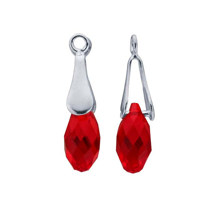 This 14-karat yellow gold pinch-style bail is specially designed to hold drilled briolette-cut stones. Simply open the bail, trim the pegs as needed and then squeeze or pinch the outer portion until the facing pegs begin to enter the holes of the bead. Slowly close the bail until both points are inside the bead hole. For a permanent mounting, use jeweler's epoxy to secure the pegs inside the holes.
