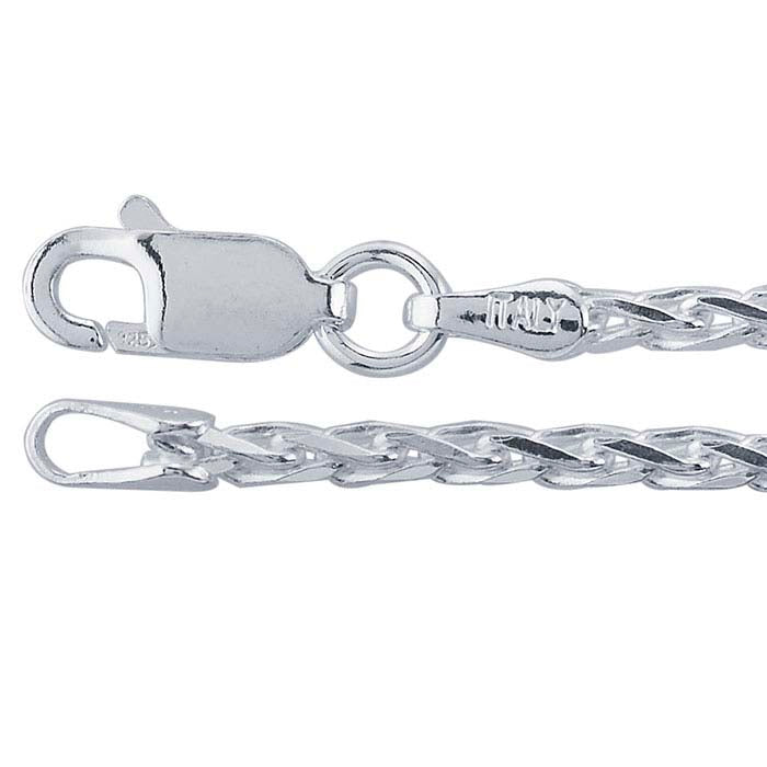 Classically styled and intricately woven, this sterling silver diamond-cut wheat chain offers a light-catching look perfectly suited for a variety of designs. Offer it as-is, or add pendants, charms, drops or dangles for customized, traditional look. This chain is plated with fine silver to ensure a bright-white color and to help protect against tarnish.