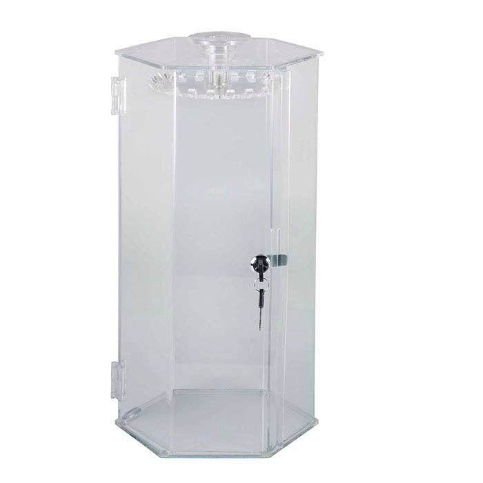 אידיאלי לשימוש על משטח עבודה, מארז האקריל מאפשר לראות בבירור 23 שרשראות ו/או תליון; תצוגת שרשראות פנימית מסתובבת מאפשרת ללקוחות לסובב את המארז כרצונם כדי לצפות בפריטים מכל זווית. המארז ניתן לנעילה לצורך אבטחה; פשוט סדרו את פריטי התכשיטים שלכם על הקרסים, ואז נעלו את המארז. האקריל בעובי 1/8" סביב צידי התצוגה, 3/16" בעובי בחלק העליון והתחתון, ועם קצוות מלוטשים; כפתור בחלק העליון מאפשר ללקוחות לסובב את התצוגה כרצונם. רגליות גומי מגנות על משטחי העבודה. כלול זוג מפתחות.