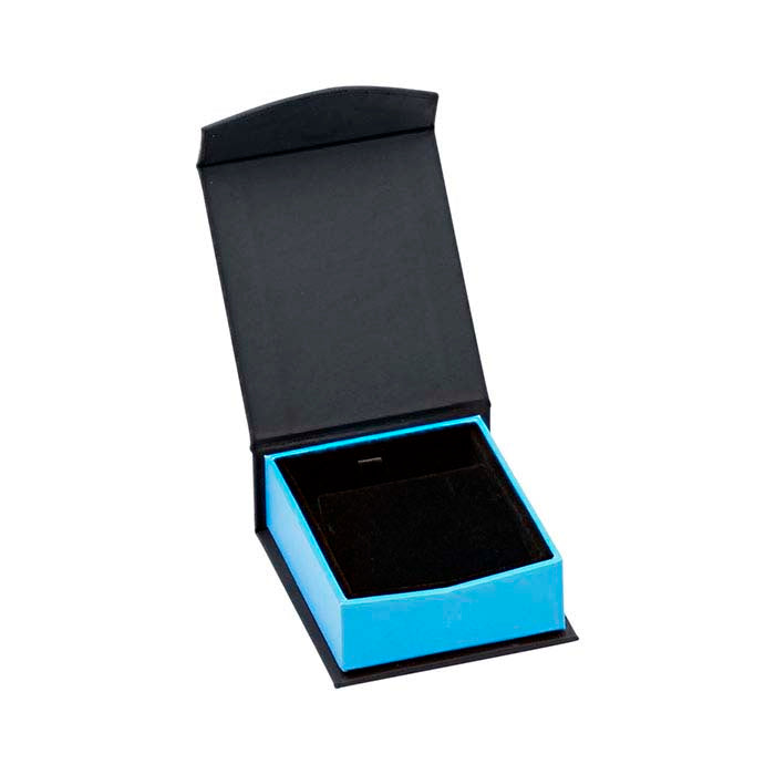 תיבת "Electric Night" בשילוב כחול בוהק ושחור זו מתאימה לתליון אחד או זוג עגילים. תבנית הצבעים התוססת, דו-גוונית, וסגירת המכסה המגנטית עם חזית מעוקלת מעניקים לתיבה מראה יוקרתי ומושך עין. הוסיפו סרט קישוט, עטיפת מתנה או פפיון (זמינים בנפרד) להתאמה אישית של התיבה. נייר חלק עם מראה ומגע של עור מלאכותי מכסה את התיבה מפלסטיק; החלק העליון והתחתון של התיבה מכוסים בנייר שחור; הצדדים מכוסים בנייר כחול בוהק. נייר שחור מכסה את פנים המכסה; קטיפה שחורה מרפדת את הצדדים הפנימיים של התיבה ומכסה את התושבת המוטה והעומדת. רצועת משיכה מסאטן מקלה על הוצאת התושבת מהתיבה מבלי לעוות או לפגוע בה. ניתן להטביע חם או להדפיס בהתאמה אישית את התיבה עם שם החברה או הלוגו שלכם, כך שתישארו בראש התודעה זמן רב לאחר מכירת התכשיטים.