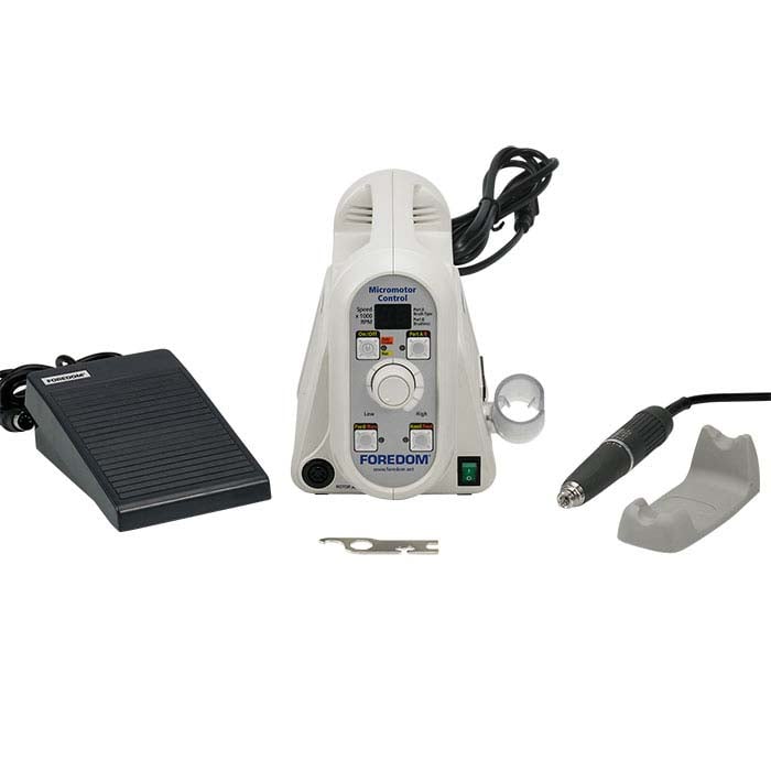 This brushless Foredom® high-torque motor, adjustable from 1,000–50,000rpm, can be run in forward or reverse and is powerful at any speed. Good for cutting, stone-setting, polishing, grinding, texturing, finishing and more. Kit includes control box, handpiece with 3/32" (2.35mm) collet, variable speed foot pedal, handpiece cradle, a second port for attaching a brush-type handpiece and an extra fuse.